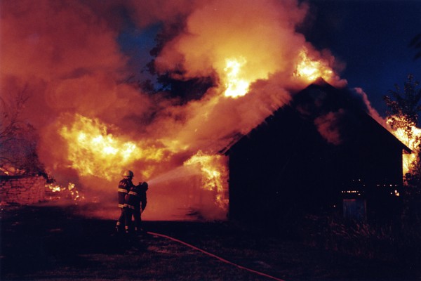 About 30 minutes after the fire started, the fire department showed up. The closest fire department is about a 25 minute drive away. Here they are spraying the piggery. The piggery, however, is filled with firewood.