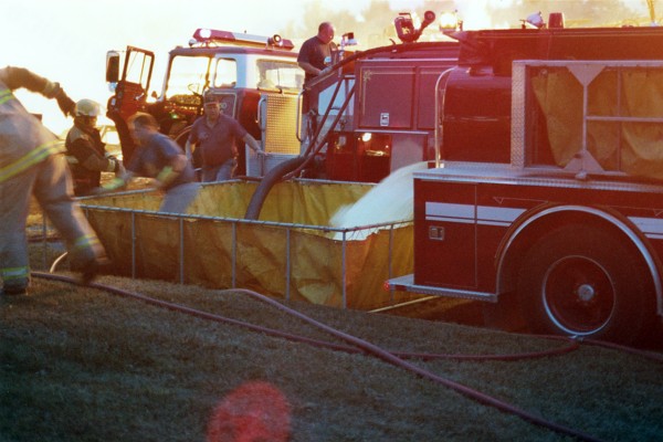 The truck in the foreground has backed up to a portable reservoir and is dumping his load. The truck in the background is sucking up this same water and blowing it into the fire.
