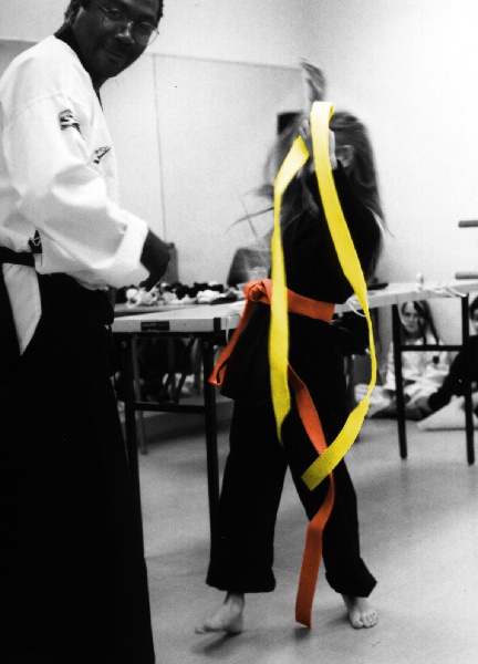 This is my daughter Stazie receiving her orange belt during the karate award ceremony (she is now a blue belt). The instructor is Sinsei Henderson. Black and white film was processed and colorized using Paintshop Pro.