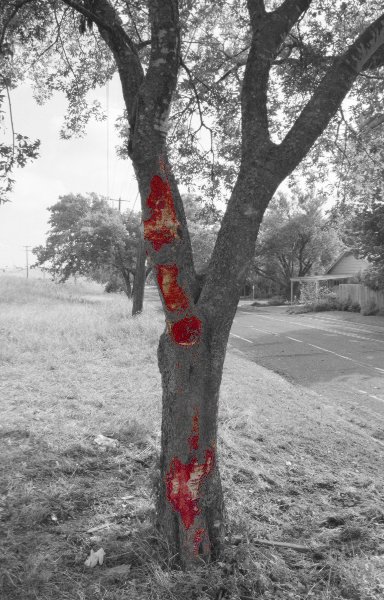 | This picture is called Wreck because it is the scene of a fatal automobile accident. This tree is located less than a block from my house. After the wreck was cleared, I took this picture and enhanced the wounds imparted to the tree by the car's roof. The car had been traveling at about 85 miles per hour in a 30 miles per hour zone when it lost control and rolled into this tree. If you look carefully, you can see medical debris on the ground. |