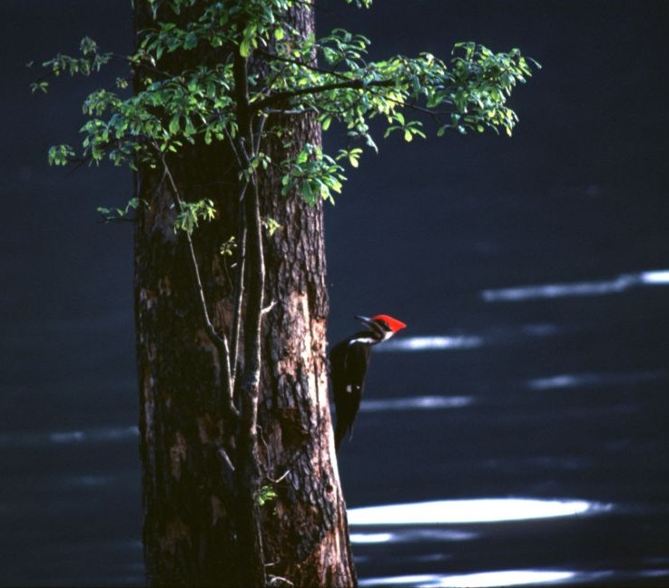 A pileated woodpecker pauses long enough for me to capture this shot. Quite amazing how still it was. I managed to capture this shot near dusk on Kodachrome 64 film using a preset 400 mm lens with a maximum aperture of f/6.3.
